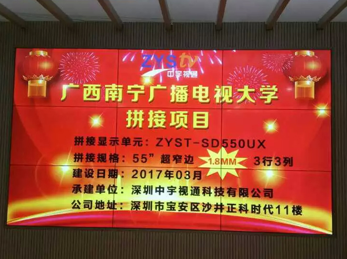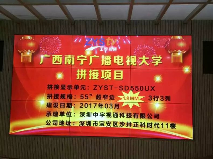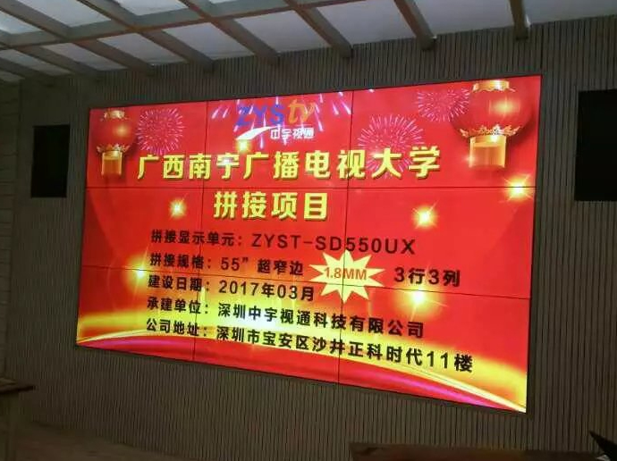 拼接項目:廣西南寧廣播電視大學拼接單元:ZYST-SD550UX拼接拼縫:1.8mm拼接規(guī)格:3*3拼接尺寸:55寸拼接屏安裝方式:壁掛承建地址:廣西南寧廣播電視大學承建日期:2017年3月承建單位:深圳中宇視通科技有限公司