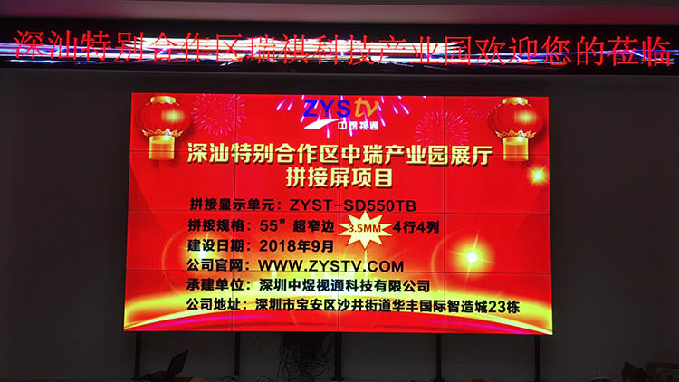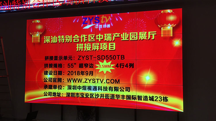 深汕特別合作區中瑞產業園展廳55寸3.5mm拼縫液晶拼接屏項目,安裝調試完成并且順利驗收,中宇視通科技全體員工從深圳發來賀電!