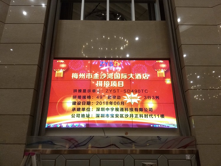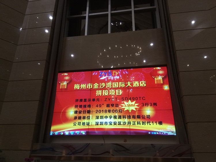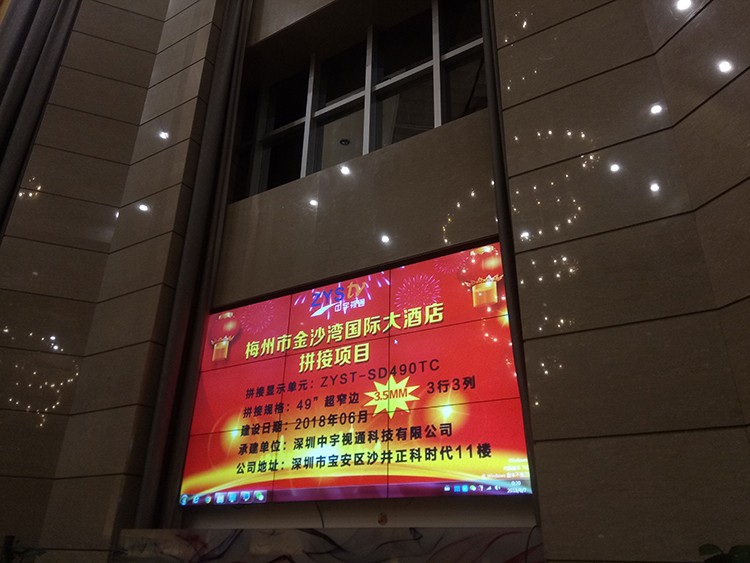 梅州市金沙灣國際大酒店選用中宇視通科技49寸3.5mm拼縫液晶拼接屏,項目安裝調試完成并且順利通過驗收。