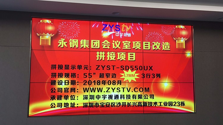 永鋼集團會議室55寸17.mm拼縫3行3列拼接屏項目采用中宇視通科技拼接屏方案,項目安裝調試完成并順利驗收。