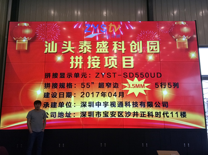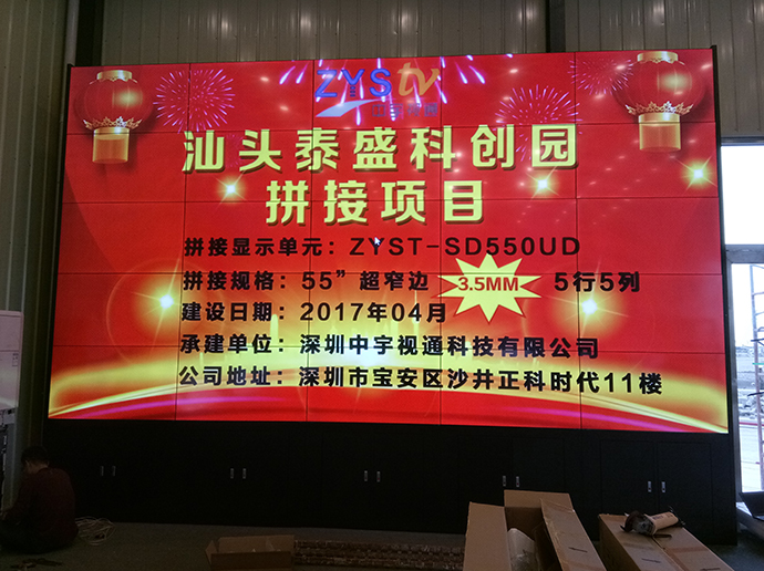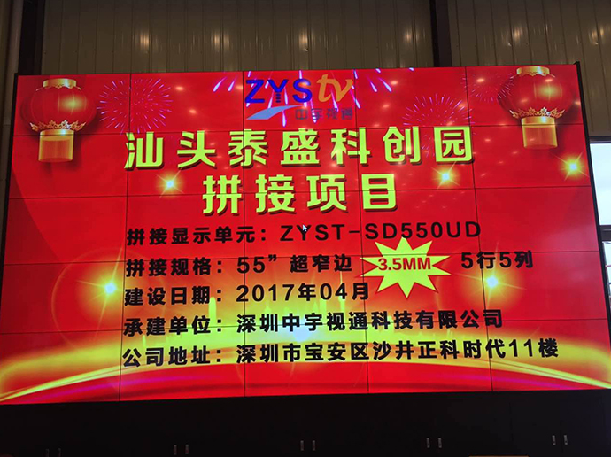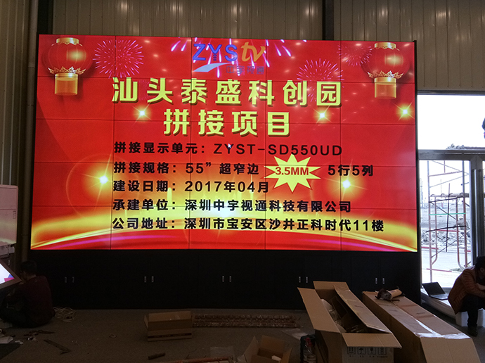 此次泰盛科技為了更好的展示公司以及園區信息,進過考察與深圳中宇視通科技有限公司攜手合作成功打造了一個5行5列55寸3.5mm拼縫拼接大屏。
